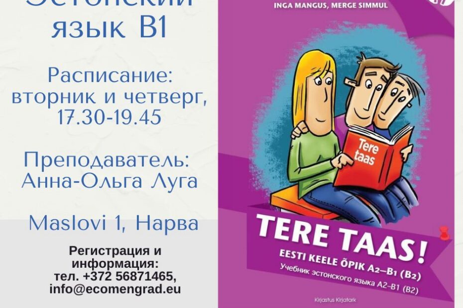 Приглашаем на курс эстонского языка B1 в Нарве.По адресу: Maslovi 1, NarvaПреподаватель: Анна-Ольга ЛугаИнформация: тел. +372 56871465, info@ecomengrad.eu Расписание: Вторник и Четверг, 17:30 — 19:45