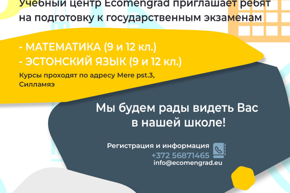 Учебный центр Ecomengrad приглашает учеников 9 и 12 классов на курсы по математике и эстонскому языку. Подготовьтесь к экзаменам вместе с опытными преподавателями в Силламяэ!